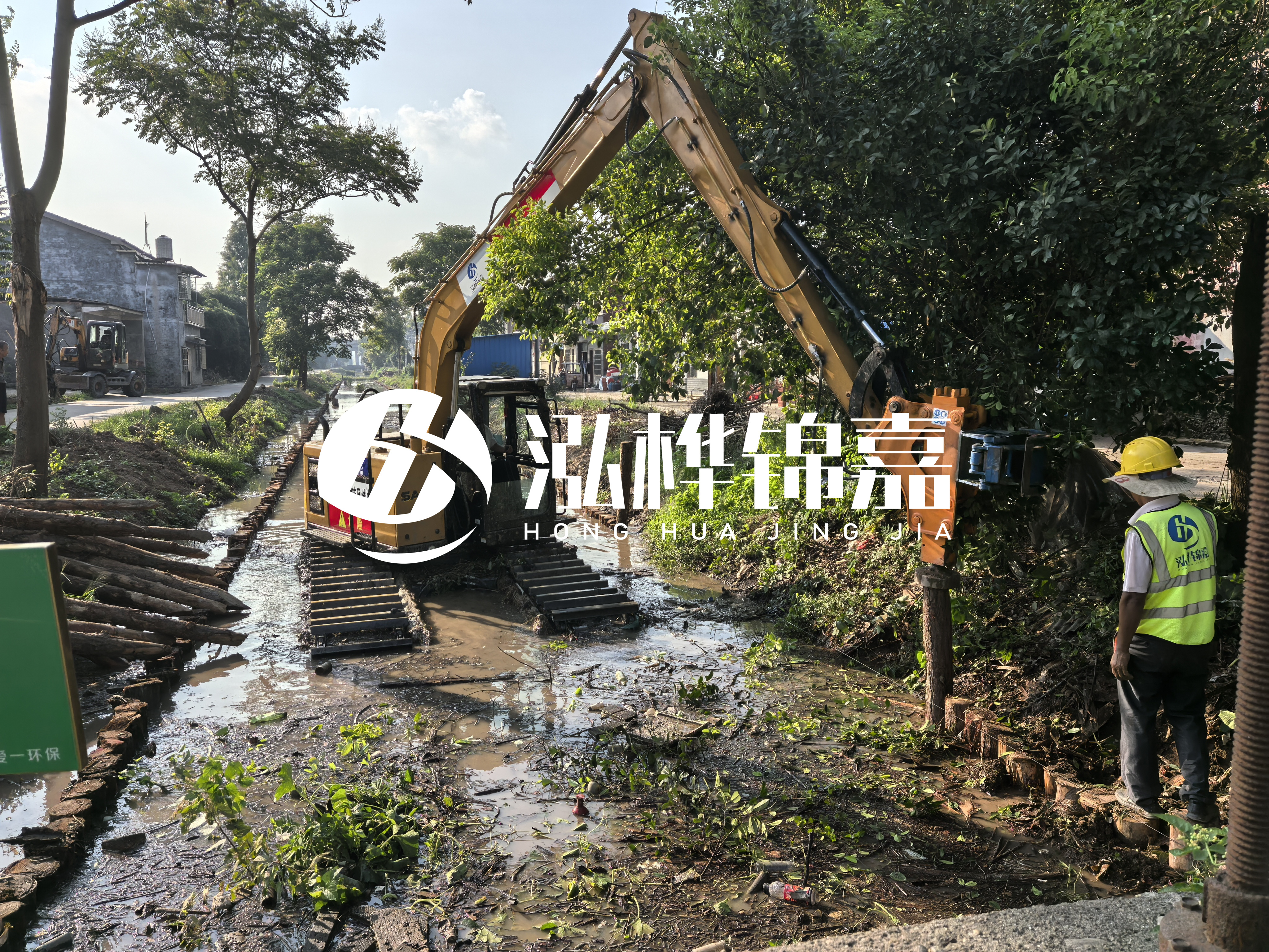 水挖(也就是水上挖掘機)的液壓錘功率直接決定能打多長的樁。普通 60 型水上挖掘機,液壓錘沖擊力有限,最多打到 5 米就很吃力了 —— 就像人用小錘子敲長釘子,容易把釘子敲彎。而大型 200 型以上的水挖,液壓系統能提供足夠的沖擊力和穩定性,才能駕馭 8 米以上的長木樁。泓樺錦嘉能打 8 米木樁,首先靠的就是設備優勢。他們用的是定制款水上挖掘機,液壓錘經過改裝,沖擊力比常規設備提升 30%,而且機身配重更合理,在水面作業時減少晃動,避免長木樁因受力不均斷裂。